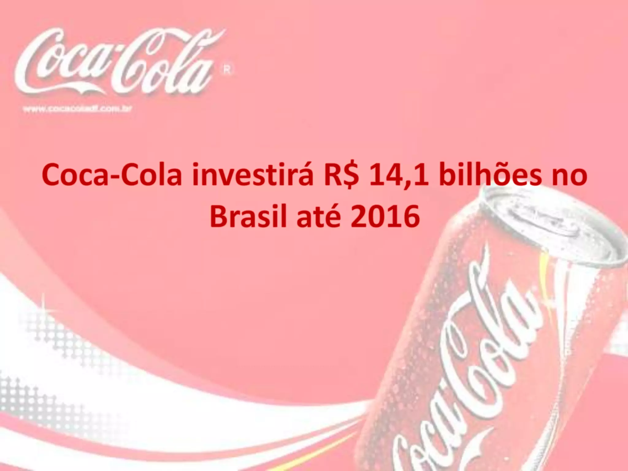 A Coca-Cola Brasil anunciou investimentos de R$14,1 bilhões até 2016, 50% a mais do que no período anterior, e que vem crescendo por 33 trimestres consecutivos. Os investimentos em 2012 serão de R$2,8 bilhões e tem como objetivo atingir metas de sustentabilidade, como fábricas verdes e maior reciclagem. A empresa é responsável por 600 mil empregos diretos e indiretos no Brasil.