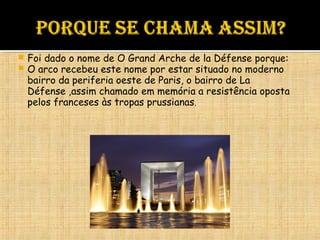 O Grand Arche de la Défense é um arco de 112 metros de altura em Paris construído em 1989 pelo arquiteto dinamarquês Otto Von Spreckelsen para simbolizar uma janela aberta ao mundo no bairro de La Défense, nomeado em memória da resistência francesa à Prússia.