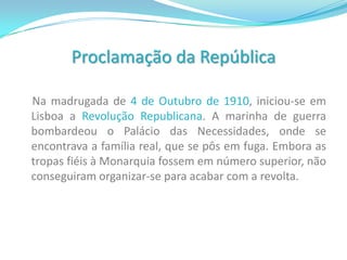 D. Carlos I foi o último rei de Portugal, caracterizado como extravagante. No final do século XIX, havia insatisfação popular devido à crise econômica. Em 1890, Portugal aceitou o ultimato inglês, indignando o povo. Em 1908, D. Carlos e seu filho foram assassinados, enfraquecendo a monarquia. Em 1910, uma revolução republicana derrubou a monarquia e estabeleceu a república em Portugal.