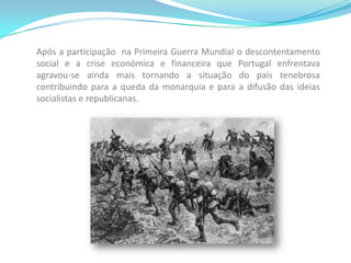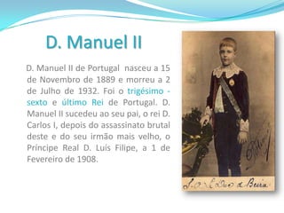 D. Carlos I foi o último rei de Portugal, reinando de 1889 até ser deposto pela implantação da República em 1910. Seu reinado foi marcado por crises econômica e política, insatisfação popular com a pobreza e enriquecimento da burguesia, e o ultimato inglês de 1890, que indignou o povo. Em 1908, D. Carlos e seu filho foram assassinados, enfraquecendo ainda mais a monarquia. Após a participação na 1a Guerra Mundial, a situação do país piorou, levando à procl