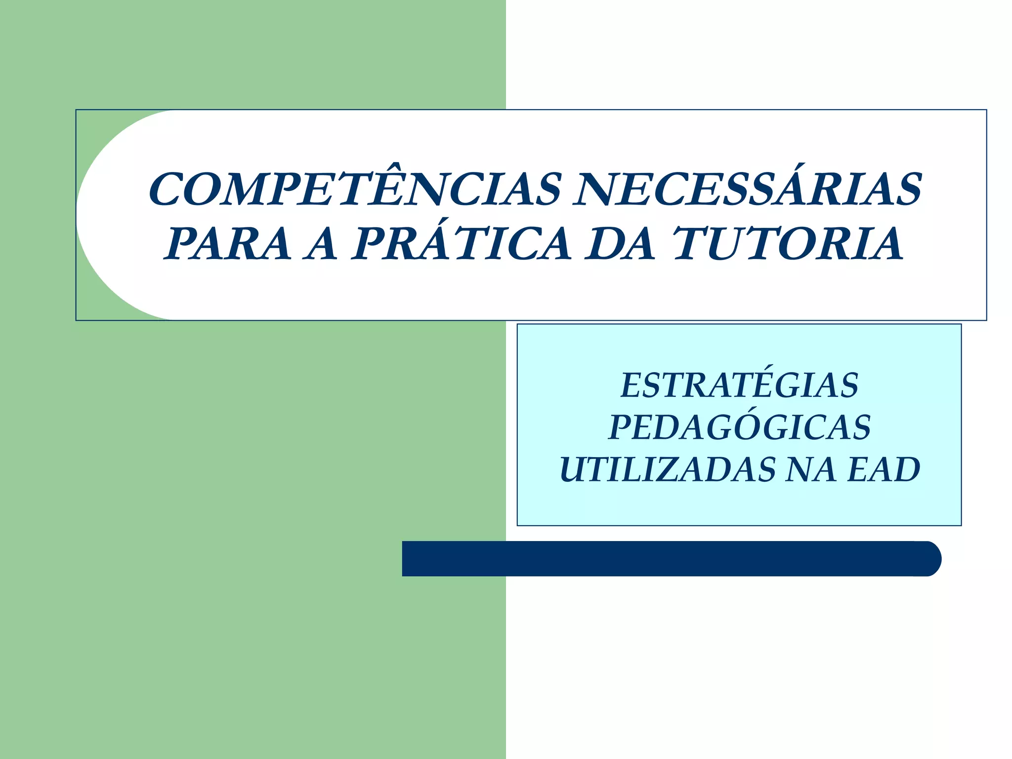 O documento descreve elementos essenciais para o sucesso da tutoria na educação a distância, como o relacionamento próximo entre tutor e aluno e o planejamento conjunto com o professor. Também apresenta estratégias pedagógicas utilizadas na EAD, como a discussão dos conteúdos, o estímulo à autoaprendizagem e a formação de grupos para avaliação.