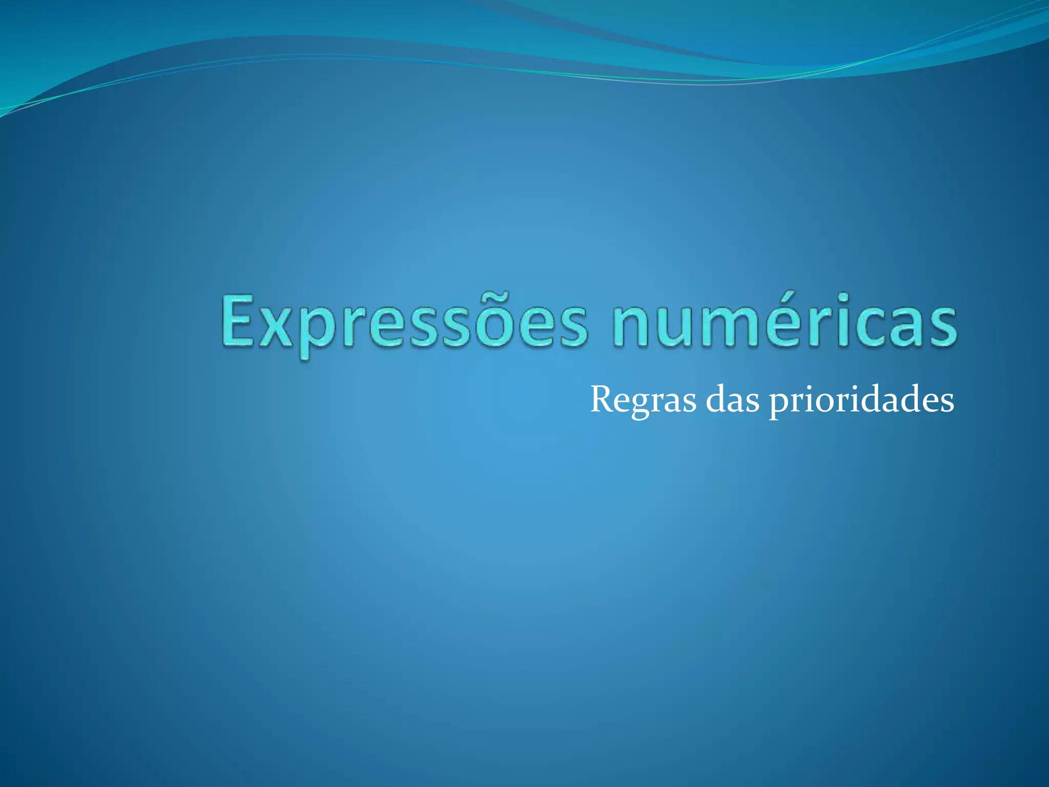 Este documento apresenta exemplos de resolução de problemas envolvendo expressões numéricas com operações de adição, subtração e multiplicação. Ensina que a multiplicação tem prioridade sobre a adição e subtração, e que os cálculos dentro de parêntesis devem ser realizados primeiro. Finalmente, pede para calcular o valor de seis expressões numéricas como exercício.