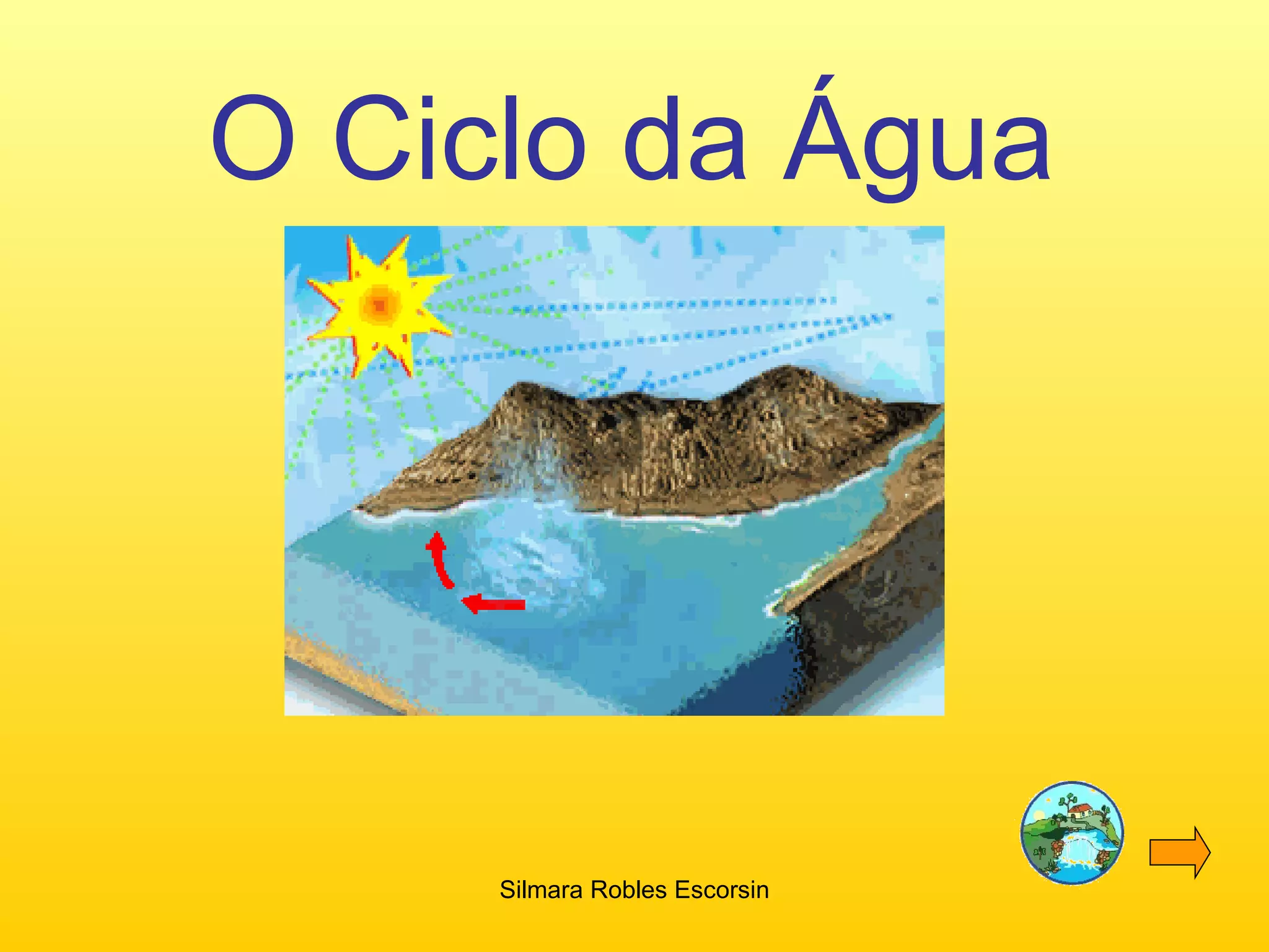 O documento descreve o ciclo da água, começando com a definição do que é o ciclo da água e suas principais fases: evaporação, condensação, solidificação e precipitação. Em seguida, conta a história de uma gotinha de água chamada Salpico que viaja pelo ciclo, desde um lago até o mar, passando pelas diferentes fases.