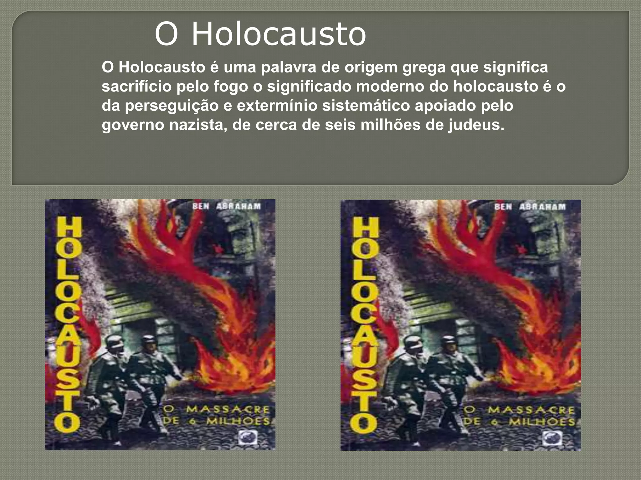 O Holocausto refere-se ao genocídio sistemático de cerca de 6 milhões de judeus pelo regime nazista na Alemanha entre 1939-1945. Os judeus eram levados para campos de concentração onde sofriam maus-tratos, fome e sede, resultando em muitas mortes, com os corpos sendo enterrados em valas comuns ou cremados. A segunda guerra mundial foi um conflito global que envolveu continentes inteiros e custou milhões de vidas.