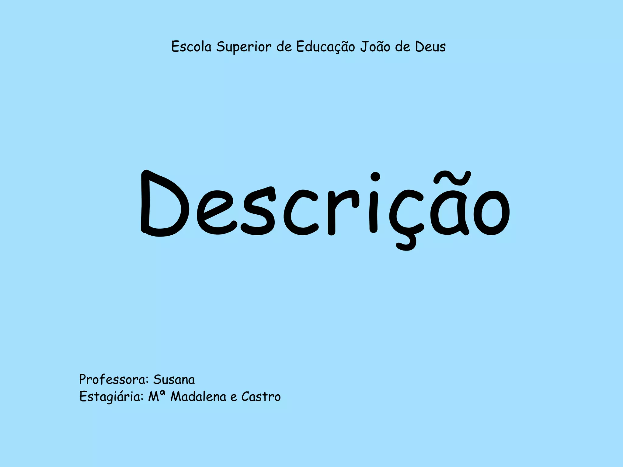 O documento fornece instruções sobre como descrever pessoas, animais e objetos. Ele define "descrever" e fornece exemplos de aspectos físicos e psicológicos a serem considerados ao descrever uma pessoa. Para animais, sugere detalhar o tamanho, pelagem, alimentação e comportamento. Para objetos, recomenda detalhar tamanho, forma, cor, material, utilidade, preço e aparência.