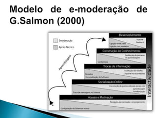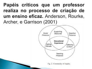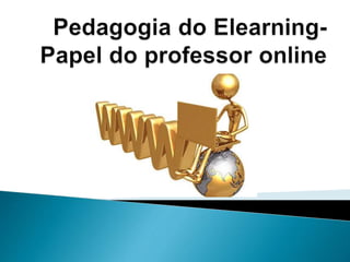 O documento discute o papel do professor em cursos elearning. Ele deve atuar como facilitador da aprendizagem, mediador das interações entre estudantes e conteúdo, e promotor da interação entre os próprios estudantes. Além disso, deve ter habilidades pedagógicas e técnicas para apoiar os estudantes no ambiente online.