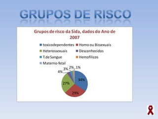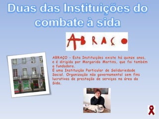 O documento discute a SIDA, incluindo o que é a doença, como se transmite, sintomas, tratamento, prevenção e discriminação contra pessoas com SIDA. Também menciona organizações que apoiam pessoas com SIDA e seus objetivos.
