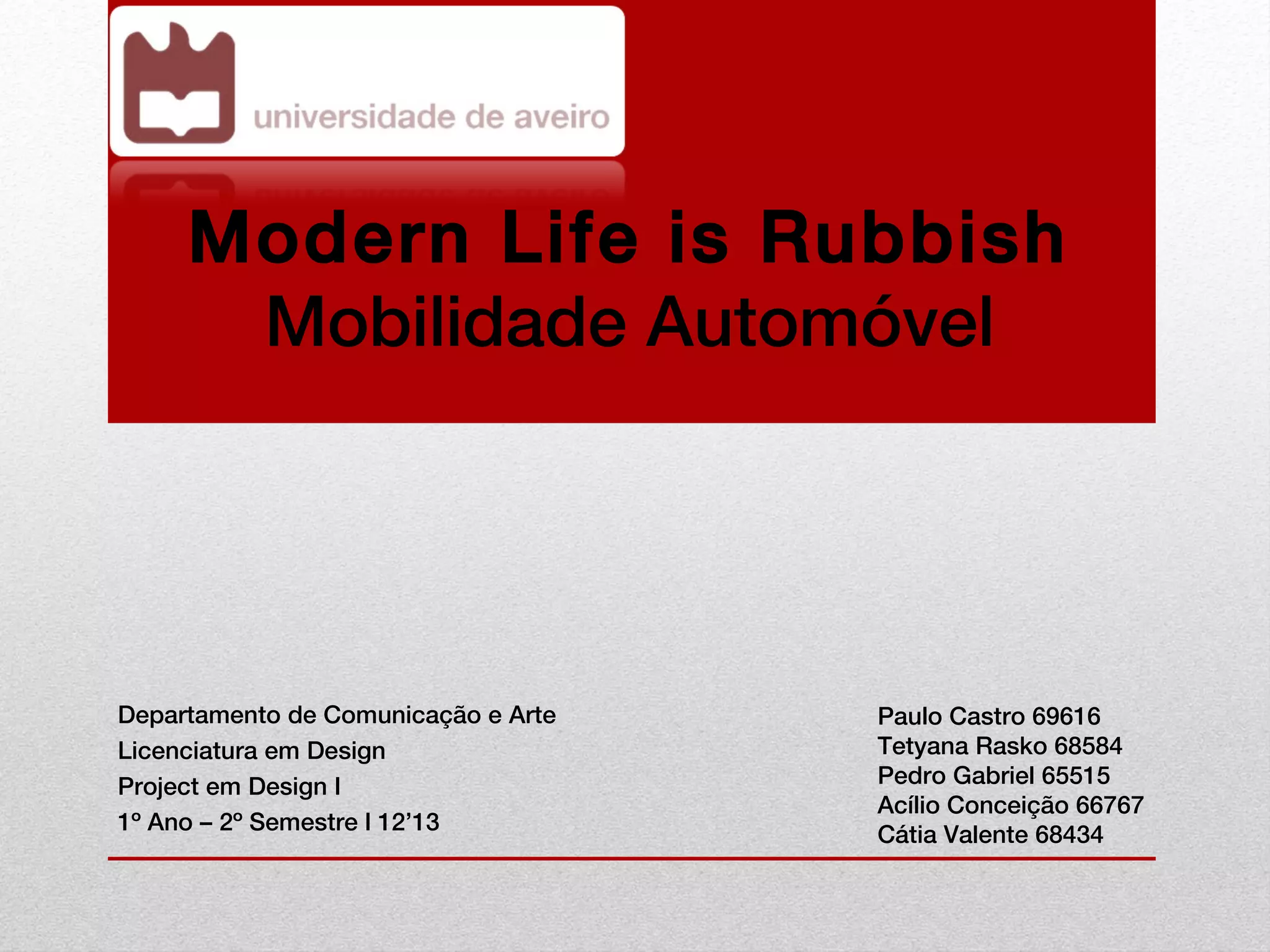 Este documento discute os meios de transporte automóvel versus bicicleta. Ele descreve uma pesquisa sobre os hábitos de mobilidade urbana e os motivos pelos quais as pessoas usam excessivamente carros. Também relata os resultados de um inquérito que mostra que as pessoas preferem bicicletas, mas citam falta de segurança e infraestrutura como barreiras para seu uso.