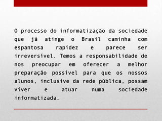 O documento discute a importância do computador na sala de aula para preparar estudantes para uma sociedade informatizada. Ele argumenta que as escolas públicas precisam introduzir computadores para não ficarem para trás em relação às escolas particulares e para preparar cidadãos familiarizados com tecnologia. Também discute como o computador pode ser usado para apoiar a aprendizagem de forma positiva.