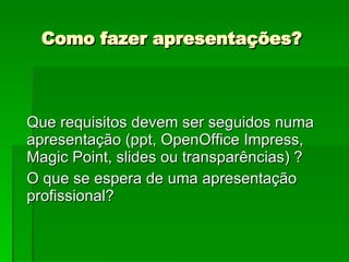 O documento fornece dicas sobre como fazer uma apresentação profissional e como NÃO fazer uma apresentação. Entre as dicas positivas estão: estudar o tema, conhecer o público, preparar um roteiro e simular a apresentação. Já entre as dicas negativas estão: ler os slides literalmente, usar muito texto e animações desnecessárias, cometer erros e não testar a apresentação antes.