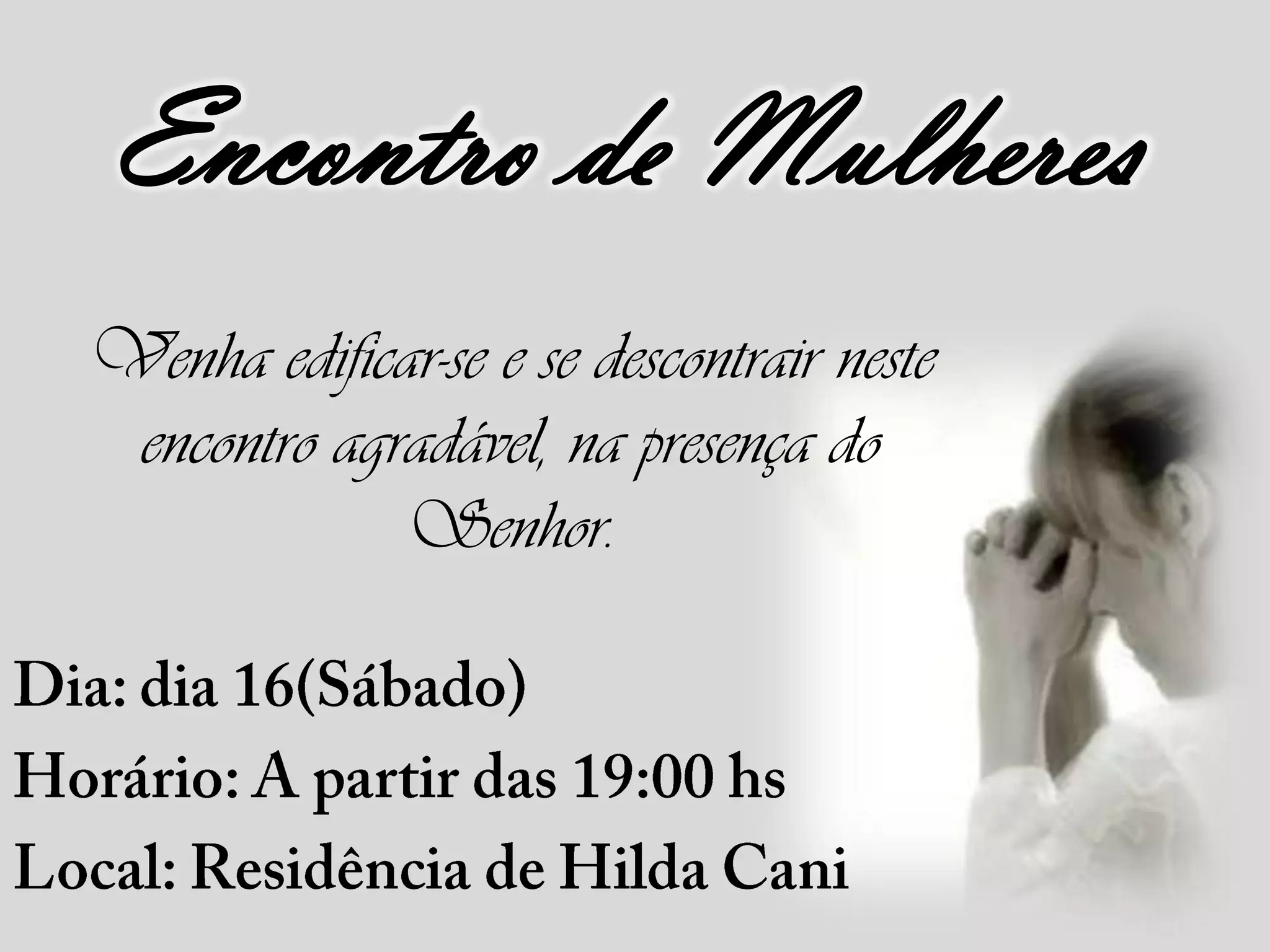 Encontro de MulheresVenhaedificar-se e se descontrair neste encontro agradável, na presença do Senhor.Dia: dia 16(Sábado)Horário: A partir das 19:00 hsLocal: Residência de Hilda Cani