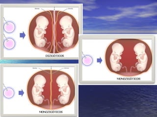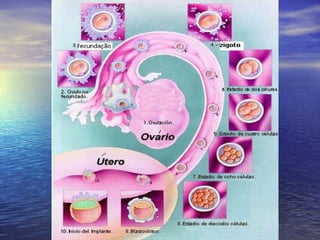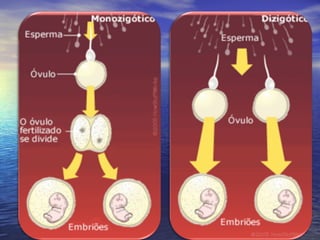 O documento resume os principais conceitos da reprodução humana, incluindo a fecundação entre o óvulo feminino e o espermatozóide masculino, o desenvolvimento embrionário desde o zigoto até o nascimento, os diferentes tipos de gravidez e métodos contraceptivos.