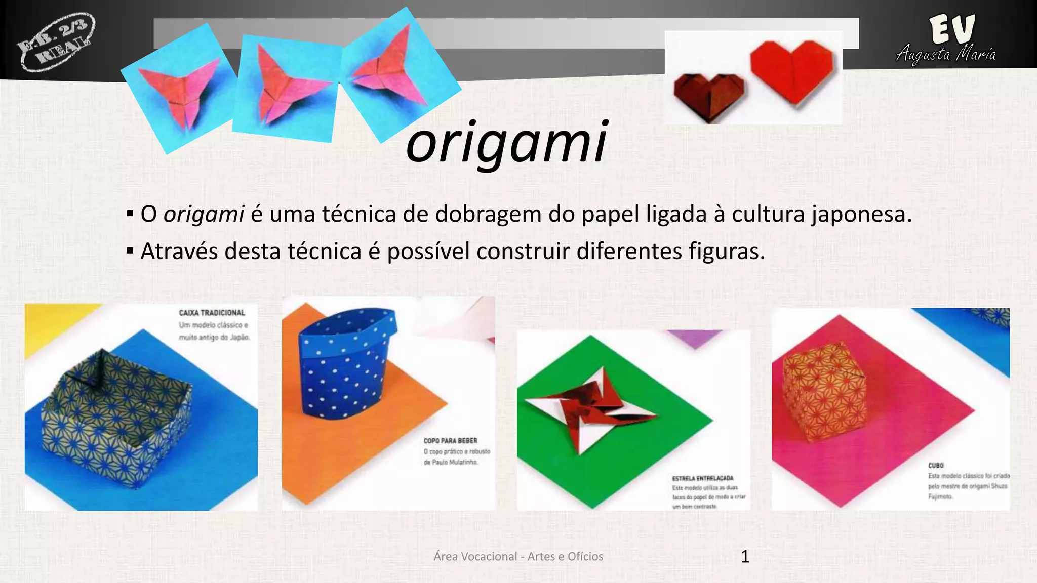 O origami é uma técnica de dobragem do papel da cultura japonesa através da qual é possível construir diferentes figuras a partir de um quadrado, utilizando dobragens básicas comuns entre os modelos.