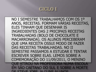 O documento descreve as atividades realizadas em diferentes séries de uma escola no primeiro e segundo semestres. As atividades incluíram receitas, regras de jogos, roteiros, entrevistas e abertura de contas de e-mail. Uma aluna da 4a série escreveu sobre como a escola ajuda as pessoas a ler, escrever e ser feliz.