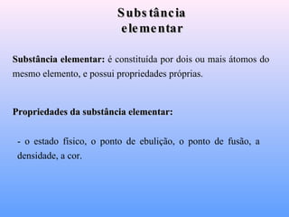 Este documento discute elementos químicos, substâncias elementares, metais, não metais e semi-metais. Define elementos como substâncias que não podem ser decompostas quimicamente, e substâncias elementares como constituídas por átomos do mesmo elemento. Descreve propriedades de metais, não metais e semi-metais, e apresenta experimentos demonstrando a condutibilidade e reatividade de vários metais.