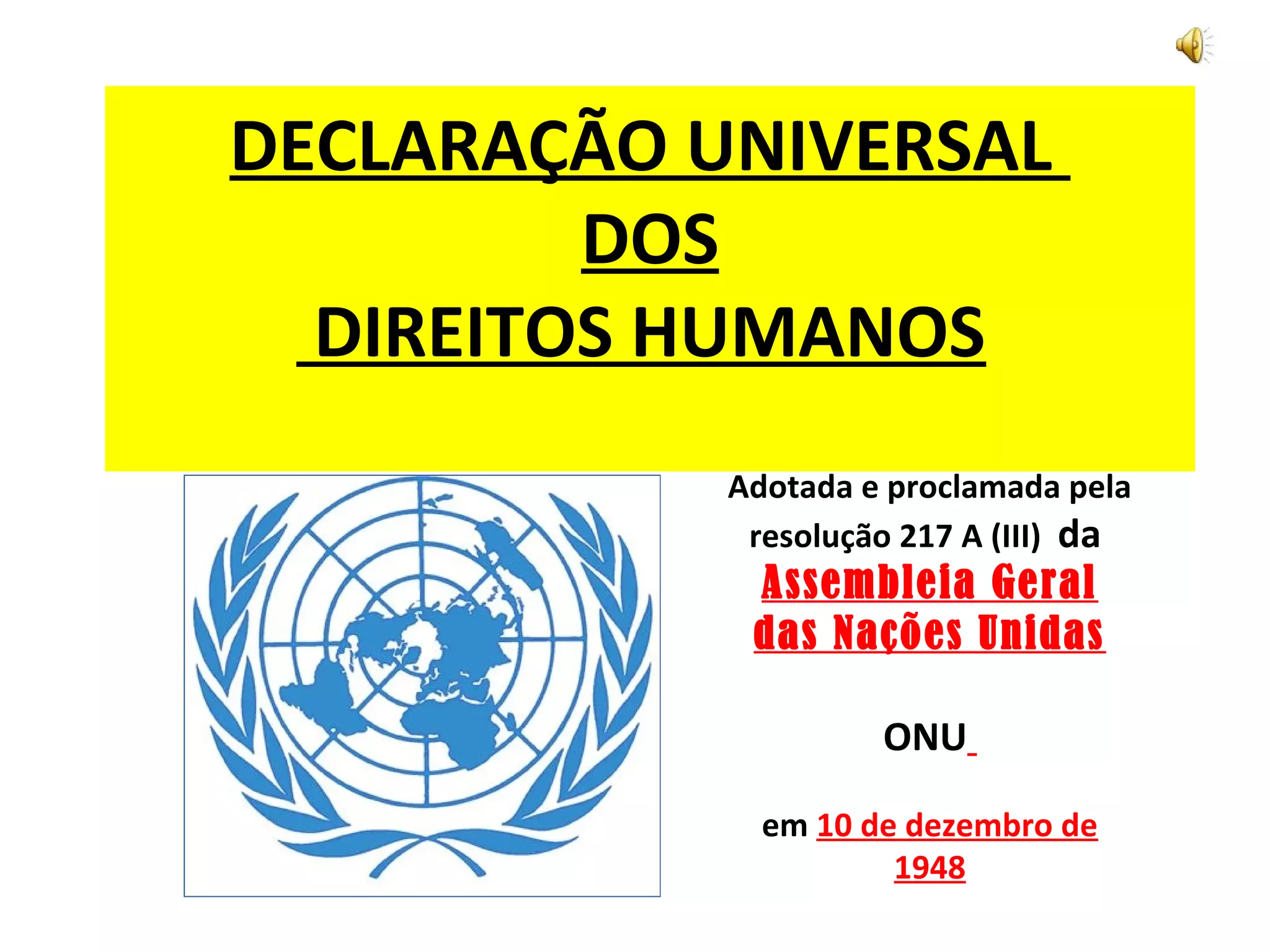 O documento descreve a Declaração Universal dos Direitos Humanos adotada pela ONU em 1948, que estabeleceu direitos fundamentais para todos os seres humanos, sem distinção. Ele lista diversos direitos como igualdade, vida digna, saúde, educação e liberdade. O objetivo é promover esses direitos através do ensino e conscientização.