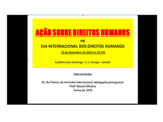 O documento descreve a Declaração Universal dos Direitos Humanos adotada pela ONU em 1948, que estabeleceu direitos fundamentais para todos os seres humanos, sem distinção. Ele lista diversos direitos como igualdade, educação, vida digna, saúde e liberdade de expressão. O objetivo é promover o respeito universal destes direitos através do ensino.