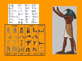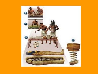 O documento descreve a antiga civilização do Egito, destacando que o vale do rio Nilo permitiu o desenvolvimento da agricultura e da sociedade egípcia. Os egípcios criaram uma escrita hieroglífica e mumificavam os mortos, removendo os órgãos internos e preservando os corpos por décadas. Eles também adoravam deuses como Osíris, Ísis e Hórus.