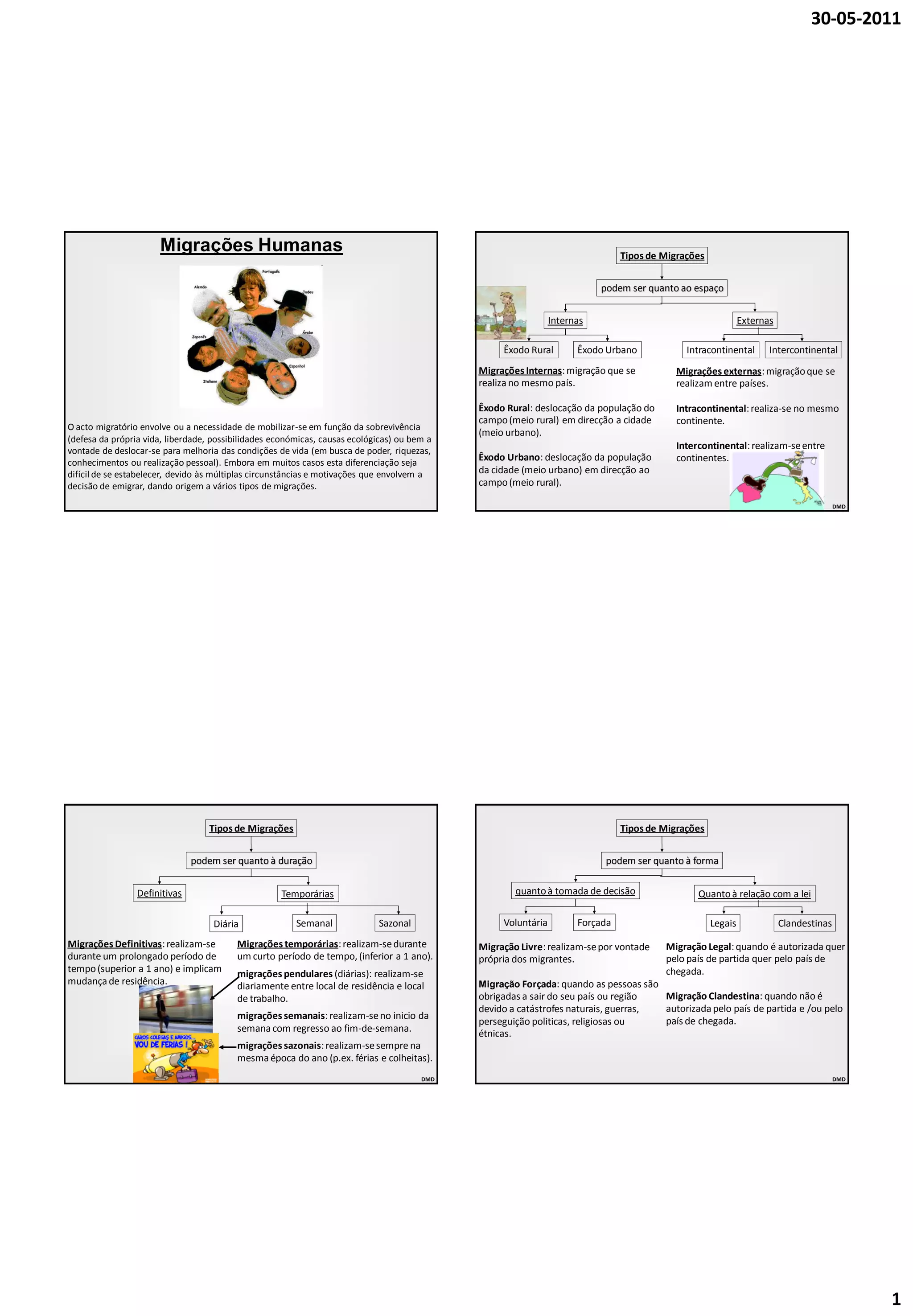O documento discute os tipos e causas de migrações humanas. Ele descreve migrações internas versus externas, temporárias versus definitivas, voluntárias versus forçadas, e legais versus clandestinas. Também lista causas econômicas, naturais, étnicas, religiosas, políticas, sociais e ambientais para migrações. Finalmente, discute consequências positivas e negativas das migrações para países de origem e destino.