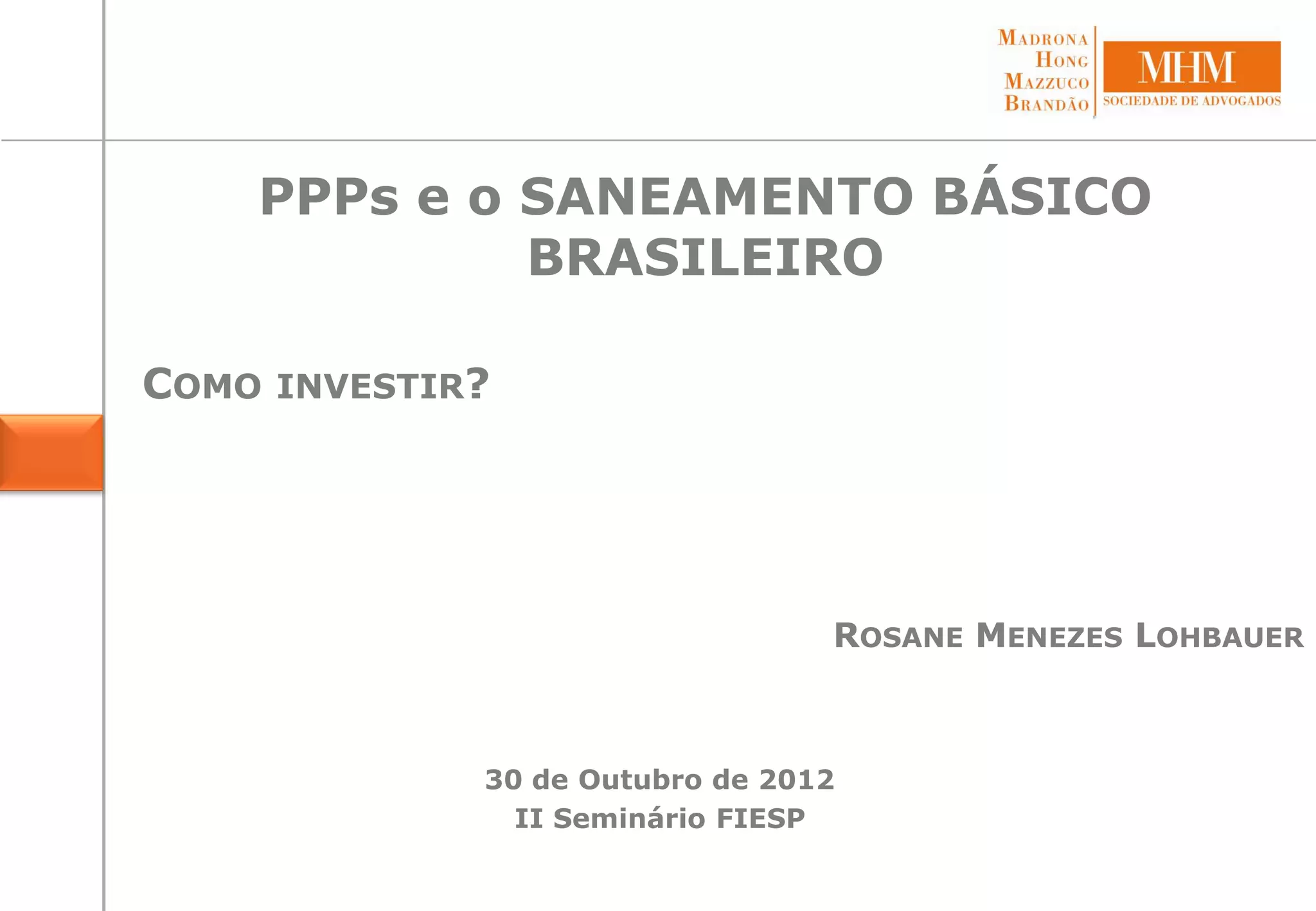 O documento discute oportunidades e desafios para investimentos no saneamento básico brasileiro por meio de Parcerias Público-Privadas (PPPs). Apresenta um panorama do setor no Brasil, marcos históricos e legislação relevante, além de exemplos de projetos de PPPs em saneamento já implementados ou em estudo e os principais desafios para este modelo de investimento.