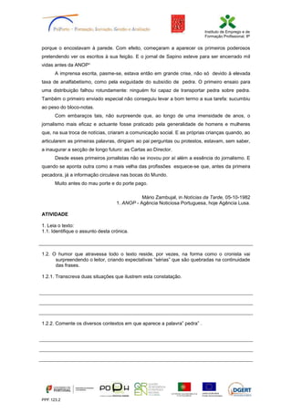 Este texto descreve a profissão de jornalista como a mais antiga do mundo, remontando aos primórdios da humanidade com Adão e Eva no Paraíso. Conta como Sapino foi o primeiro a escrever notícias em pedras e criou o primeiro "jornal de parede", enfrentando desafios como a censura e falta de meios. Apesar das dificuldades, o jornalismo perdurou através da troca de informações entre as pessoas.