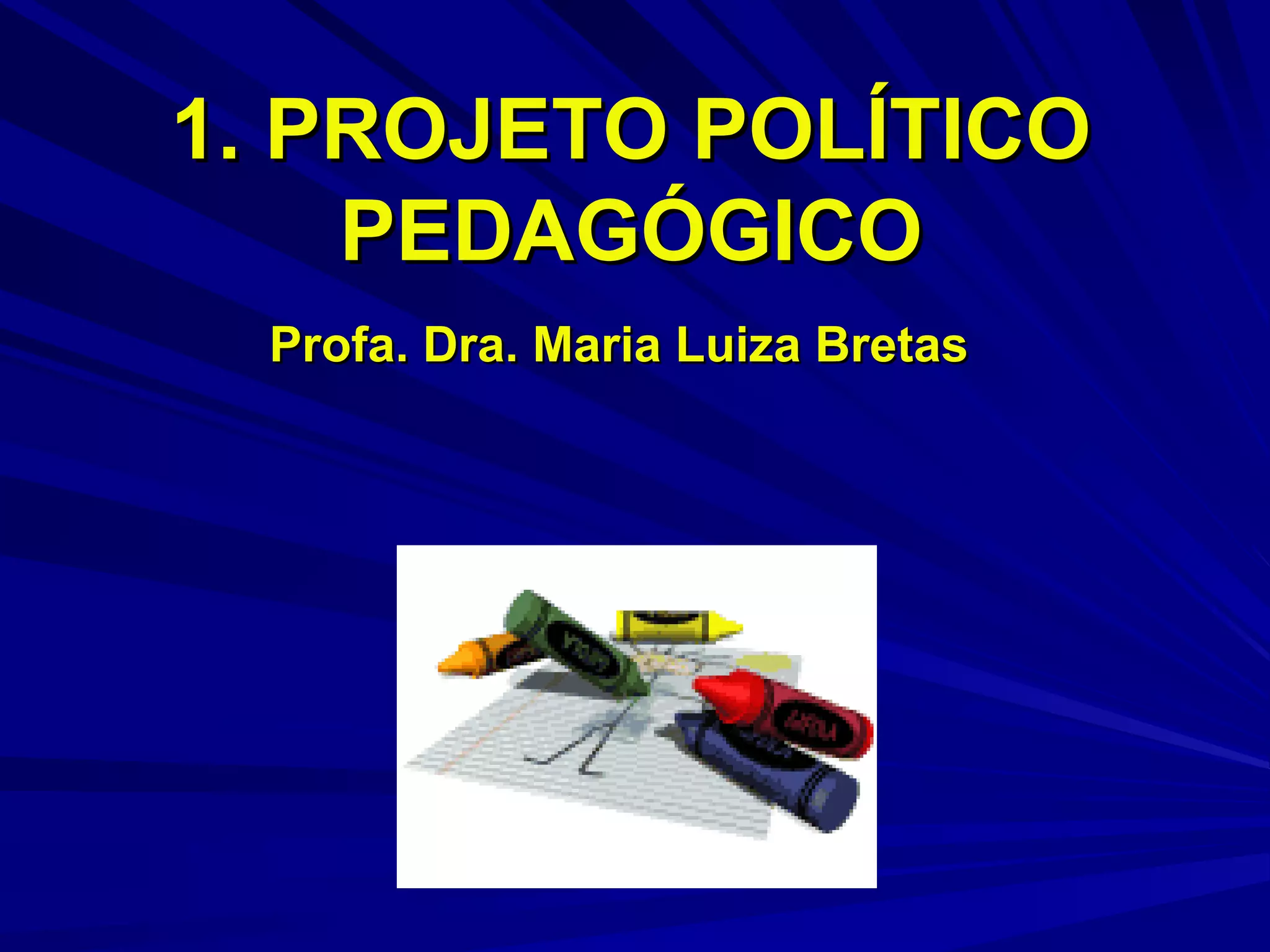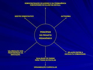 O documento discute os principais aspectos de um projeto político pedagógico para escolas, incluindo sua definição, objetivos, dimensões, princípios orientadores e processo de construção coletiva. É destacado que um PPP deve refletir a identidade e realidade de cada escola e ser revisado periodicamente com a participação de toda a comunidade escolar.