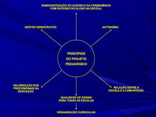 O documento discute a importância do projeto político-pedagógico para escolas. Ele define o projeto como o instrumento que estabelece a identidade da escola e orienta suas práticas educativas. Também discute os princípios que devem orientar a construção do projeto, como gestão democrática, qualidade do ensino e relação com a comunidade.