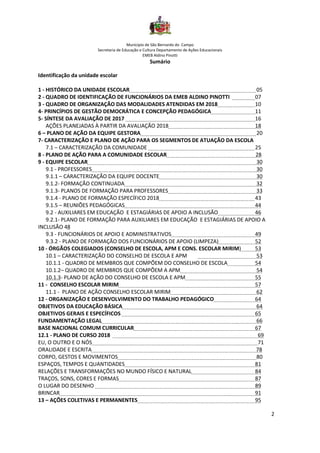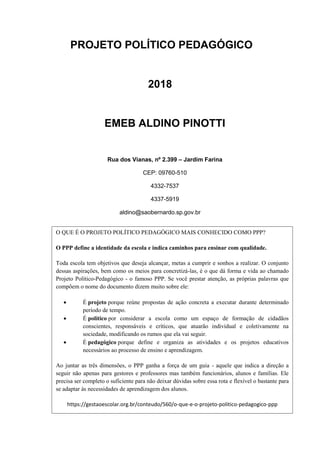 O documento fornece informações sobre o Projeto Político Pedagógico (PPP) da EMEB Aldino Pinotti para 2018, incluindo: