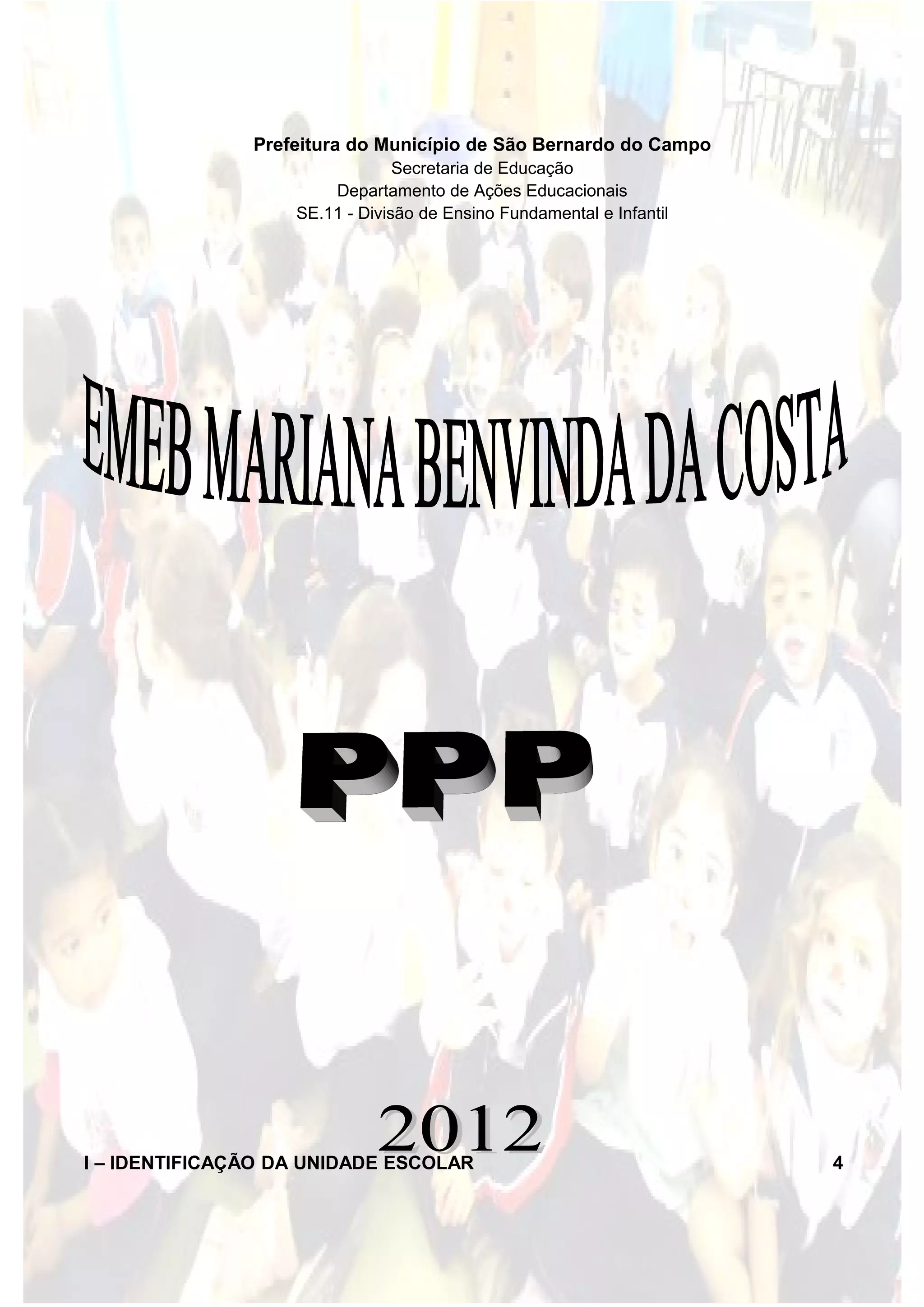 Este documento fornece informações sobre a Escola Municipal de Educação Básica "Mariana Benvinda da Costa" em São Bernardo do Campo. Ele inclui a identificação da escola, a biografia da patrona, o quadro de funcionários, a concepção pedagógica, caracterização da comunidade escolar, planos de ação para diferentes segmentos da escola e organização do trabalho pedagógico.