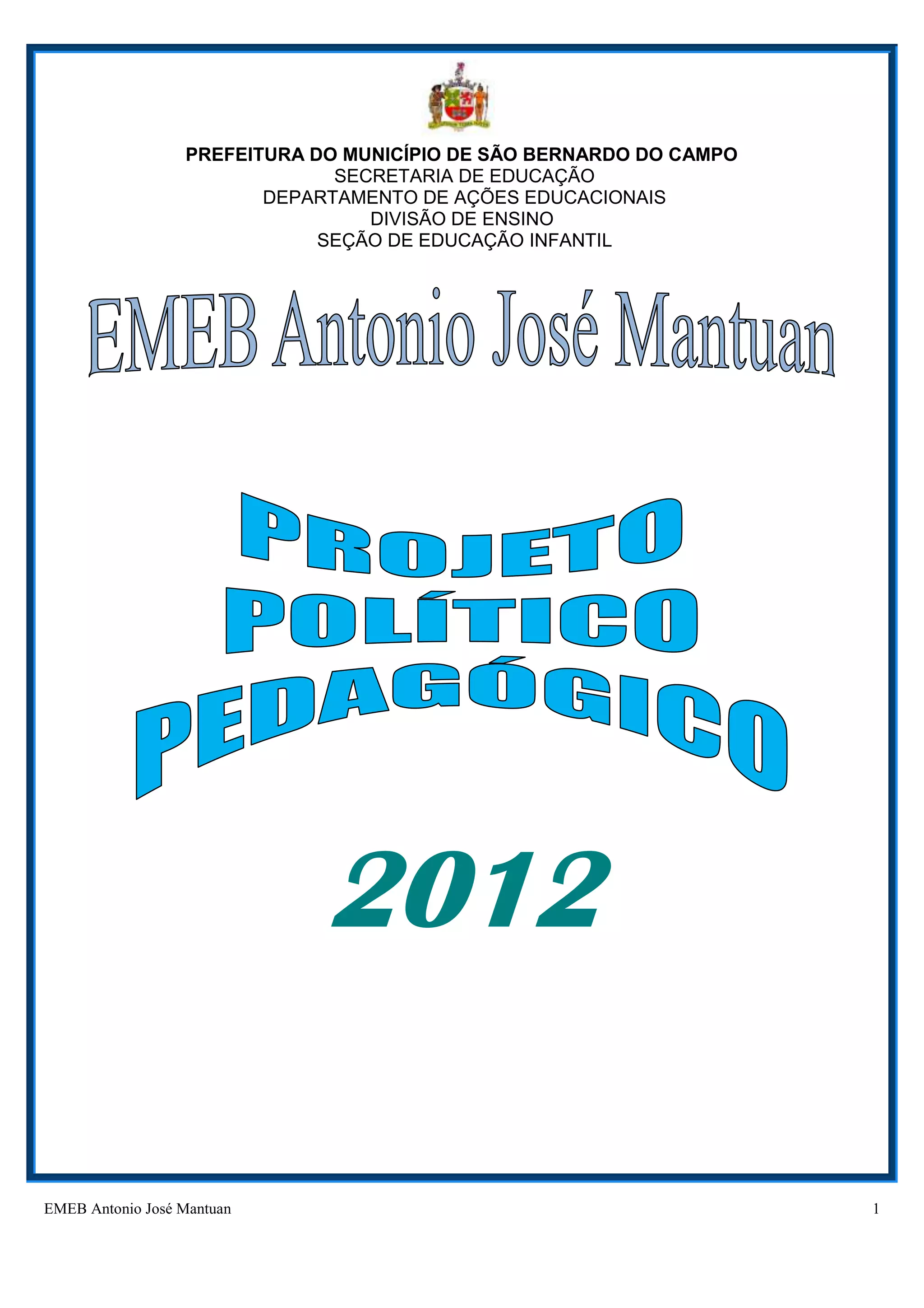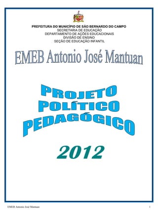 Este documento descreve o projeto político pedagógico de uma escola municipal em São Bernardo do Campo para 2012. Resume os principais pontos da organização da escola, caracterização dos segmentos da comunidade escolar, objetivos pedagógicos, planos de ação e avaliação.