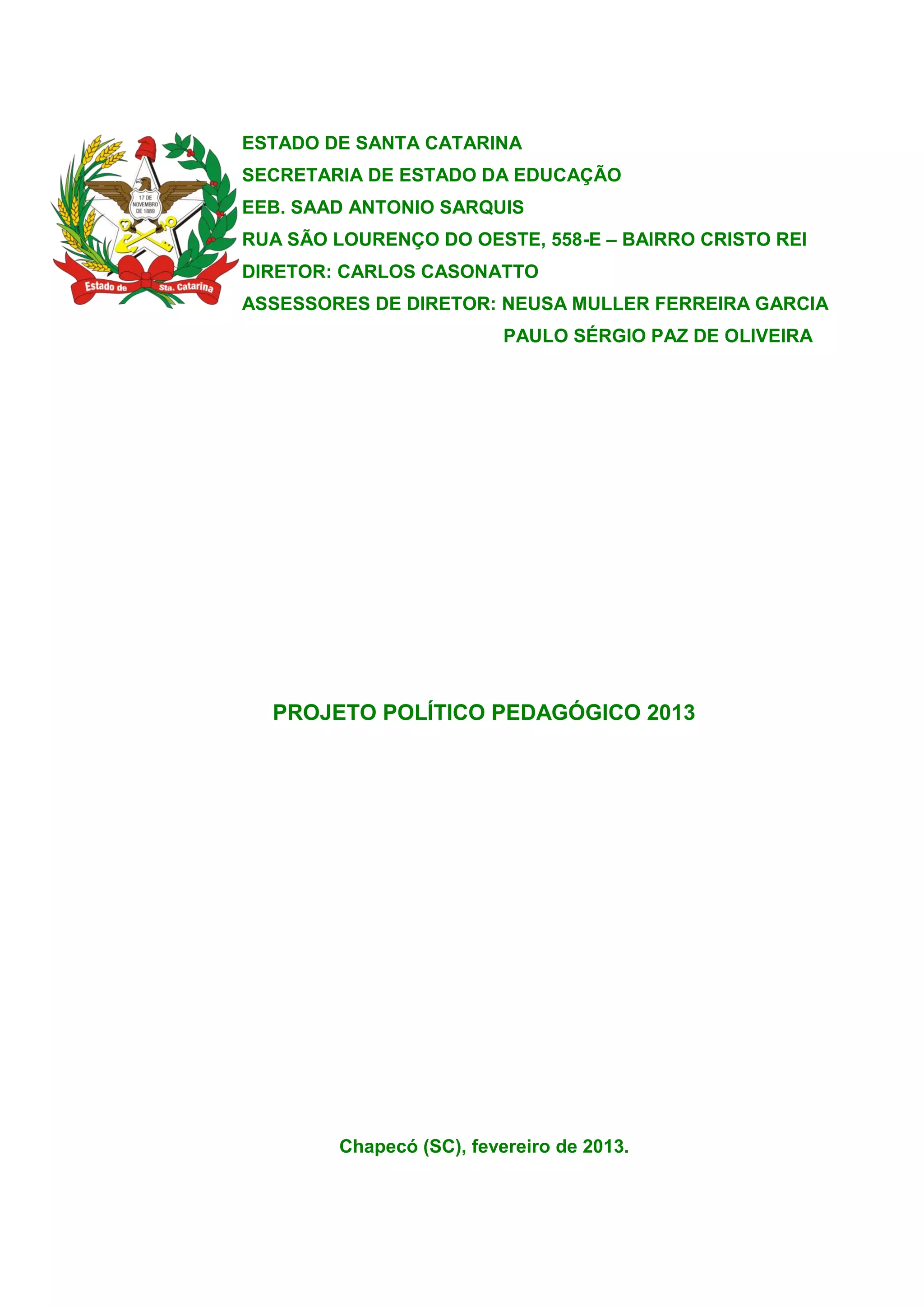 Este documento fornece um resumo do Projeto Político Pedagógico da Escola de Educação Básica Saad Antônio Sarquis para o ano de 2013. O documento descreve a estrutura administrativa e pedagógica da escola, incluindo corpo docente, currículo, avaliação de alunos e projetos educacionais oferecidos.