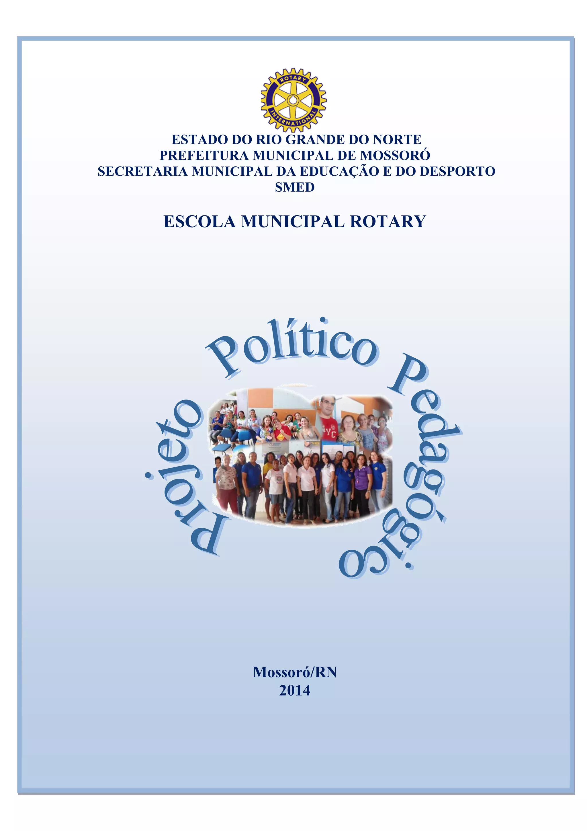 O documento apresenta o Projeto Político Pedagógico da Escola Municipal Rotary para o ano de 2014. Nele constam informações sobre a história da escola, diagnóstico da situação atual, objetivos, perfil dos educadores e alunos, competências e habilidades esperadas, metodologias de ensino, avaliação, tempo escolar, convivência escolar e recursos disponíveis. O PPP tem como objetivo nortear as ações educativas da escola de forma democrática e participativa, visando a preparação dos alunos para o exercício