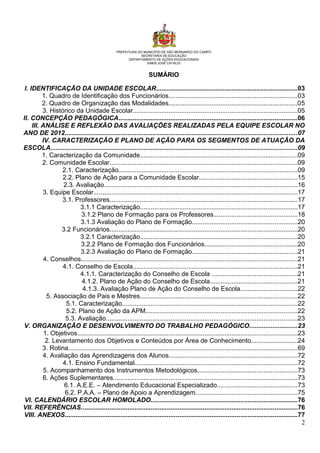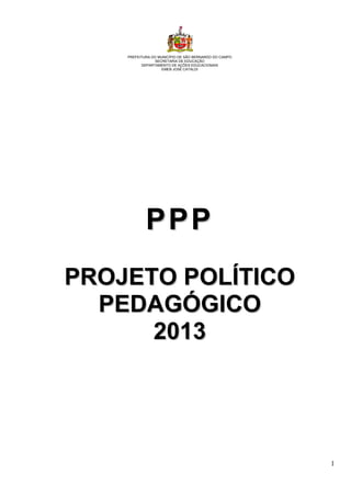 Este documento apresenta o projeto político pedagógico da EMEB José Cataldi para o ano de 2013. Ele inclui a identificação da unidade escolar, concepção pedagógica, análise das avaliações de 2012, caracterização e plano de ação para a comunidade escolar, equipe escolar e conselhos, organização do trabalho pedagógico e calendário escolar. O foco é melhorar o ensino e aprendizagem dos alunos por meio de formação continuada dos professores e funcionários e envolvimento da comunidade.