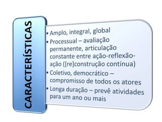 O documento discute a autonomia da escola e as dimensões de um projeto político-pedagógico, incluindo pedagógica, política, administrativo-financeira e jurídica. Ele também fornece instruções sobre como construir um projeto político-pedagógico, incluindo passos como diagnóstico, definição de bases, plano de atividades e implementação.