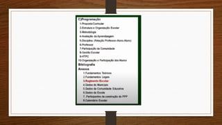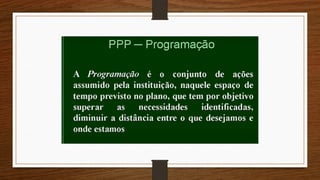 O Projeto Político-Pedagógico(ou Projeto Educativo) é o plano global da instituição. Pode ser