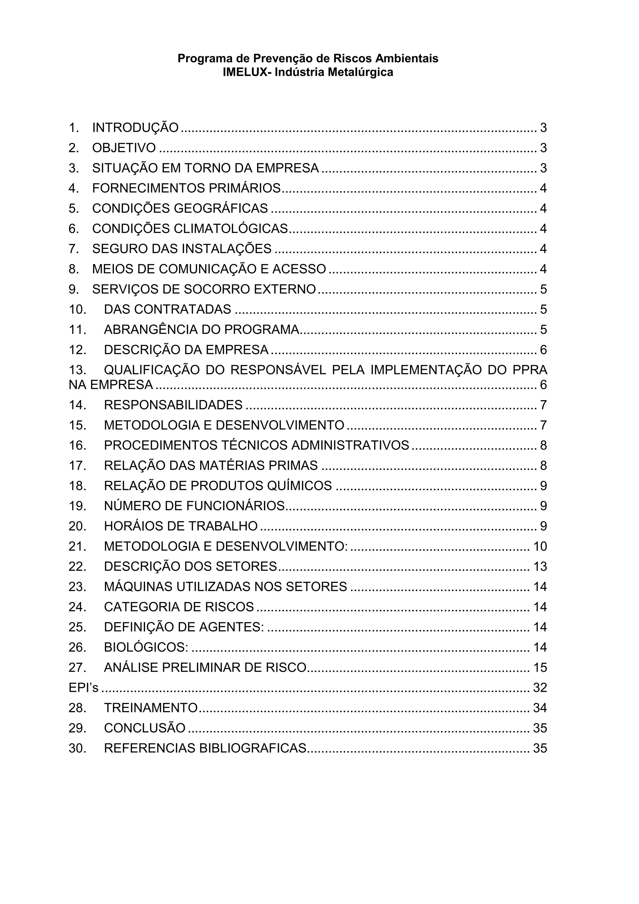 Este documento apresenta o Programa de Prevenção de Riscos Ambientais (PPRA) da empresa IMELUX Indústria Metalúrgica de acordo com a NR-09. O relatório descreve a empresa, os riscos ambientais identificados em cada setor, as medidas de controle de riscos implantadas e o treinamento dos funcionários. O objetivo é antecipar, reconhecer, avaliar e controlar os riscos ambientais existentes ou potenciais no ambiente de trabalho para preservar a saúde dos trabalhadores.