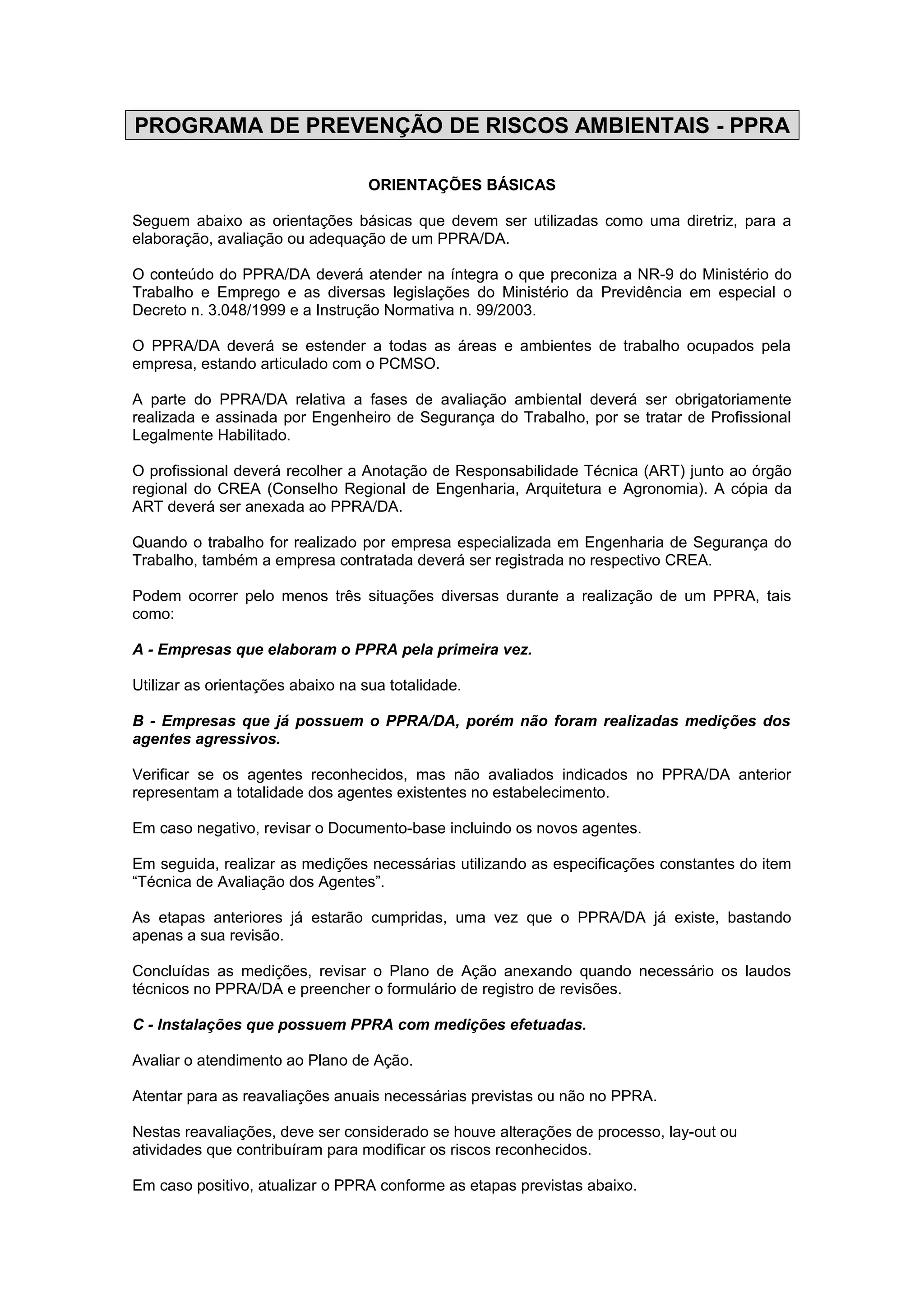 O documento fornece orientações básicas sobre a elaboração de um Programa de Prevenção de Riscos Ambientais (PPRA), incluindo a necessidade de atender à legislação aplicável, abranger todas as áreas de trabalho e ser integrado com outros programas de saúde e segurança.