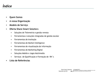 Este documento apresenta a empresa Share Smart Solutions e sua oferta de produtos e serviços. A empresa fornece soluções nas áreas de gestão escolar, avaliação, telemetria, inteligência de mercado, visualização de informações e marketing digital. A empresa tem escritórios em Portugal, Moçambique e Brasil e colabora com parceiros para transformar, otimizar e operar vendas empresariais.