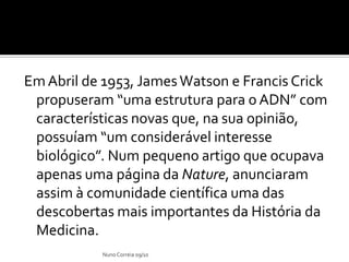 Este documento descreve a proposta histórica de Watson e Crick em 1953 de uma estrutura em dupla hélice para o DNA, anunciando uma das descobertas mais importantes da história da medicina. Apesar de terem recebido o Prémio Nobel, a contribuição de outros cientistas como Maurice Wilkins foi também importante.