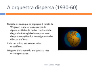 Durante os anos após a morte de Wegener, as ideias da deriva continental e da geodinâmica global caíram em desuso, com cada pesquisador voltando aos seus estudos específicos. Posteriormente, estudos da morfologia oceânica e da idade das rochas levaram à formulação da Teoria da Tectônica de Placas, que explica a deriva dos continentes e a expansão dos fundos oceânicos.