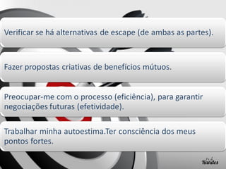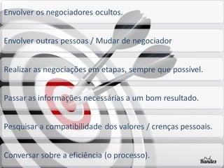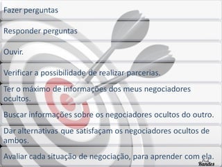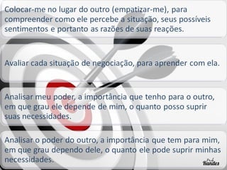 O documento discute a importância e os benefícios da negociação. A negociação é descrita como uma forma essencial de alcançar acordos quando as partes têm interesses tanto comuns quanto opostos. O documento também explora vários motivos pelos quais a negociação é necessária, como pensamentos e interesses divergentes entre as pessoas, recursos limitados e a necessidade de governar para grupos sociais diferentes.