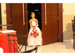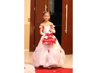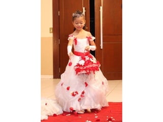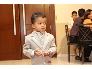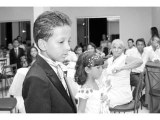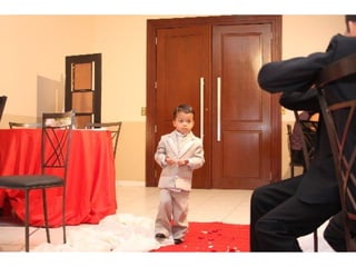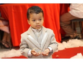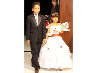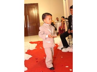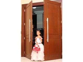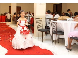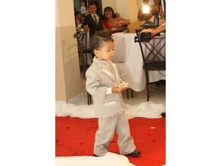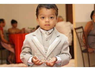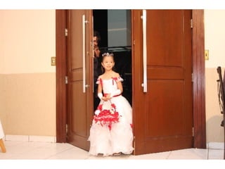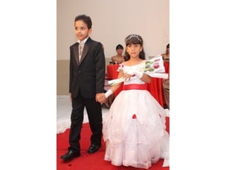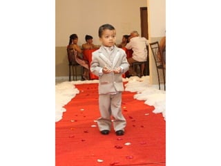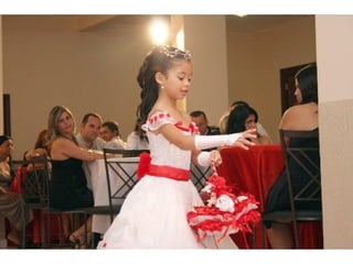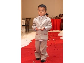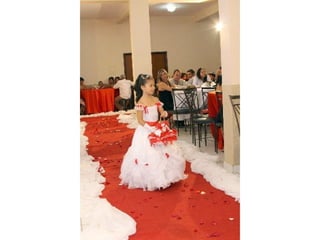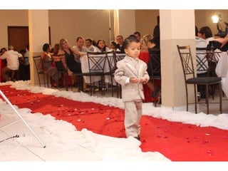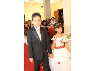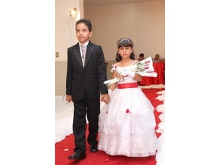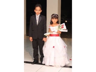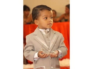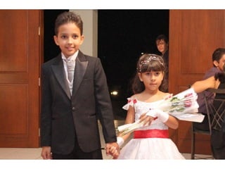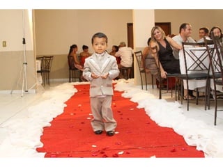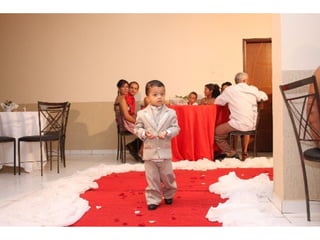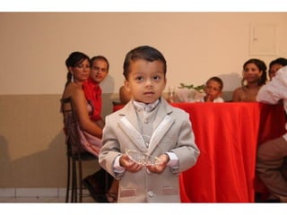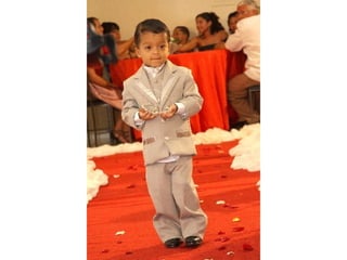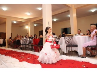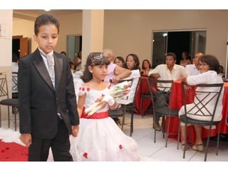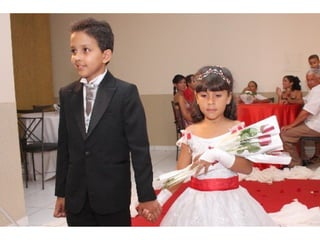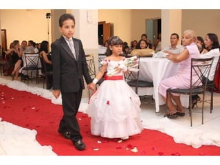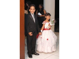 Um casal de honra levou uma petalista para a porta da igreja para entregar as alianças durante a cerimônia de casamento.