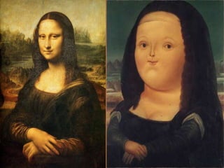 O documento discute os fatores de textualidade e intertextualidade em obras de arte, poesia e fotografia. Compara a Pietá de Michelangelo com um poema de Drummond de Andrade e uma foto sobre dor. Também analisa a paródia na pintura de Botero da Mona Lisa e relações entre o quadro Guernica de Picasso e um poema de Lorca sobre touradas. Explica conceitos como coesão, coerência, informatividade e outros fatores na construção de textos.