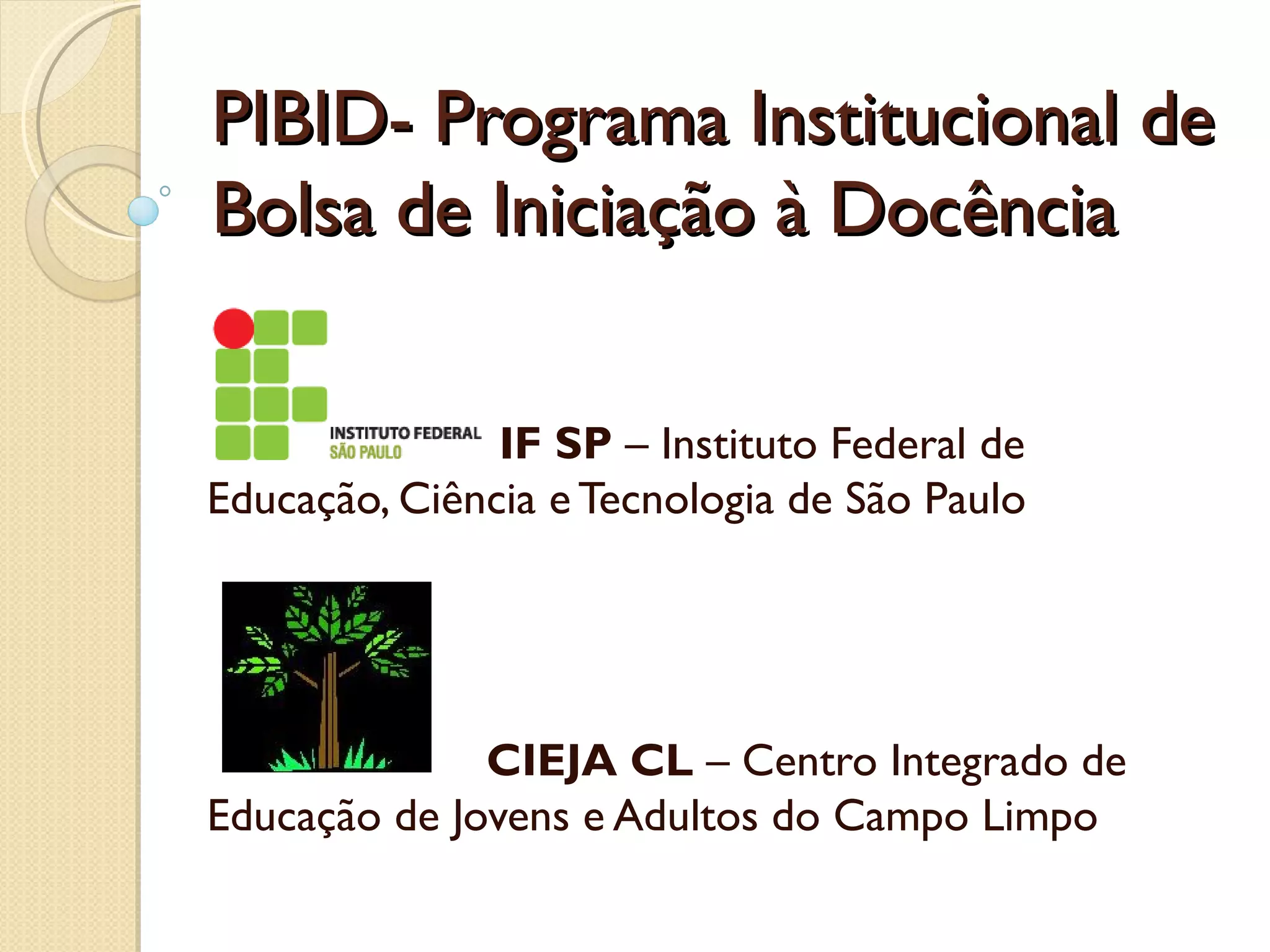O documento descreve o Programa Institucional de Bolsa de Iniciação à Docência (PIBID) no Centro Integrado de Educação de Jovens e Adultos do Campo Limpo (CIEJA CL) em 2010-2011, com objetivos de propiciar estágio aos bolsistas e possibilitar intervenções pedagógicas. O programa contou com 14 bolsistas em cada ano letivo e teve como foco observações em sala de aula, elaboração de propostas de intervenção e discussão sobre equipamentos culturais da região.