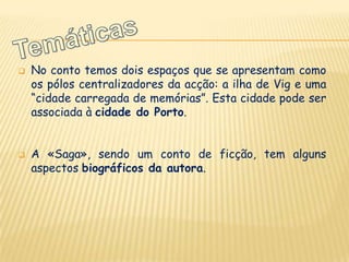 O documento analisa as semelhanças entre a história da família da autora Sophia de Mello Breyner Andresen e o conto "Saga". A família da autora veio da Dinamarca e estabeleceu-se no Porto no século XIX, onde fez fortuna com negócios de vinho, tal como retratado no conto. O documento explora as referências à cidade do Porto no conto e conexões com a vida real da autora.