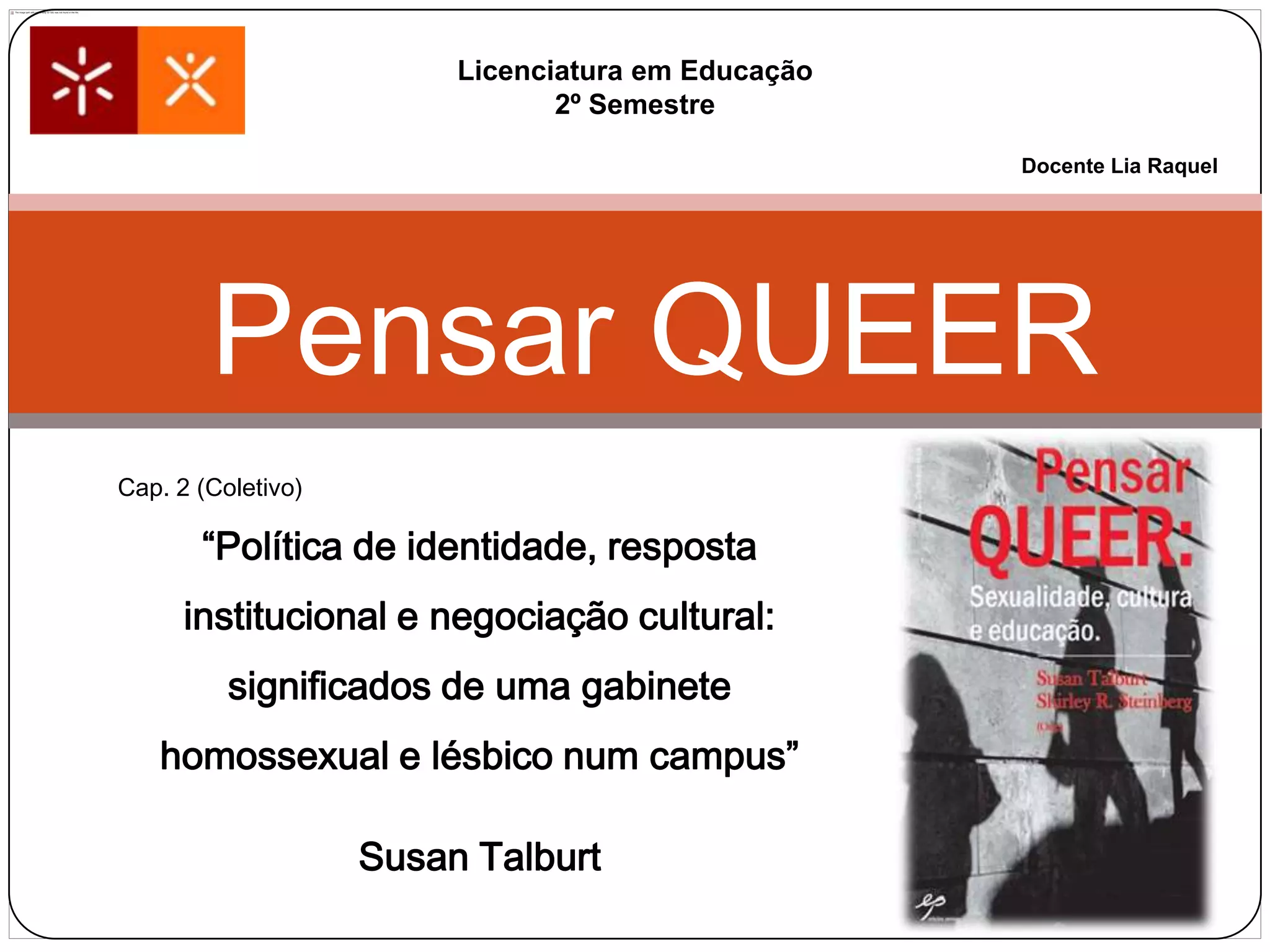 Este capítulo descreve a criação de um gabinete de apoio para estudantes homossexuais e lésbicas em uma universidade liberal nos EUA. A universidade enfrentou controvérsia sobre a política de identidade e o reconhecimento institucional. Após um ano, a maioria considerou o gabinete útil, mostrando como a negociação cultural pode promover a inclusão na instituição.