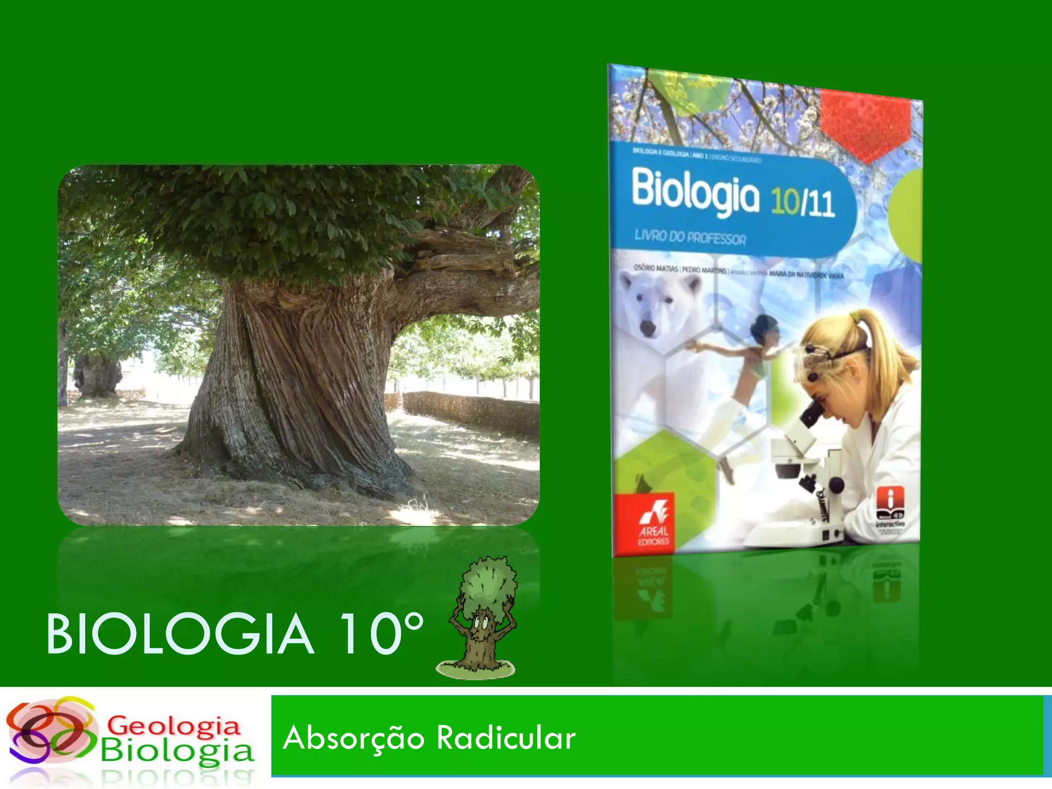 O documento descreve como as plantas absorvem água e sais minerais através do sistema radicular. O sistema radicular é permeável, ramificado e possui pêlos absorventes que aumentam sua área. A água tende a entrar na planta por osmose devido ao meio intracelular das raízes ser hipertônico em relação ao exterior. Os íons minerais entram na raiz por difusão simples ou transporte ativo com gasto de energia quando suas concentrações no solo são elevadas.
