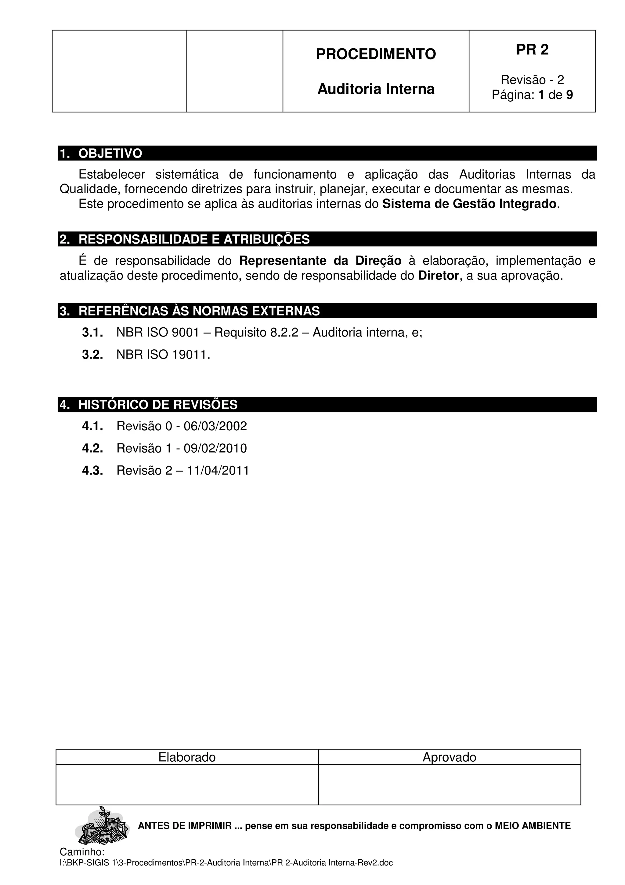 Este documento estabelece diretrizes para a realização de auditorias internas de qualidade em uma empresa. Ele define os objetivos, responsabilidades, referências, histórico de revisões, definições, observações e procedimentos para planejar, executar, documentar e acompanhar as auditorias internas.