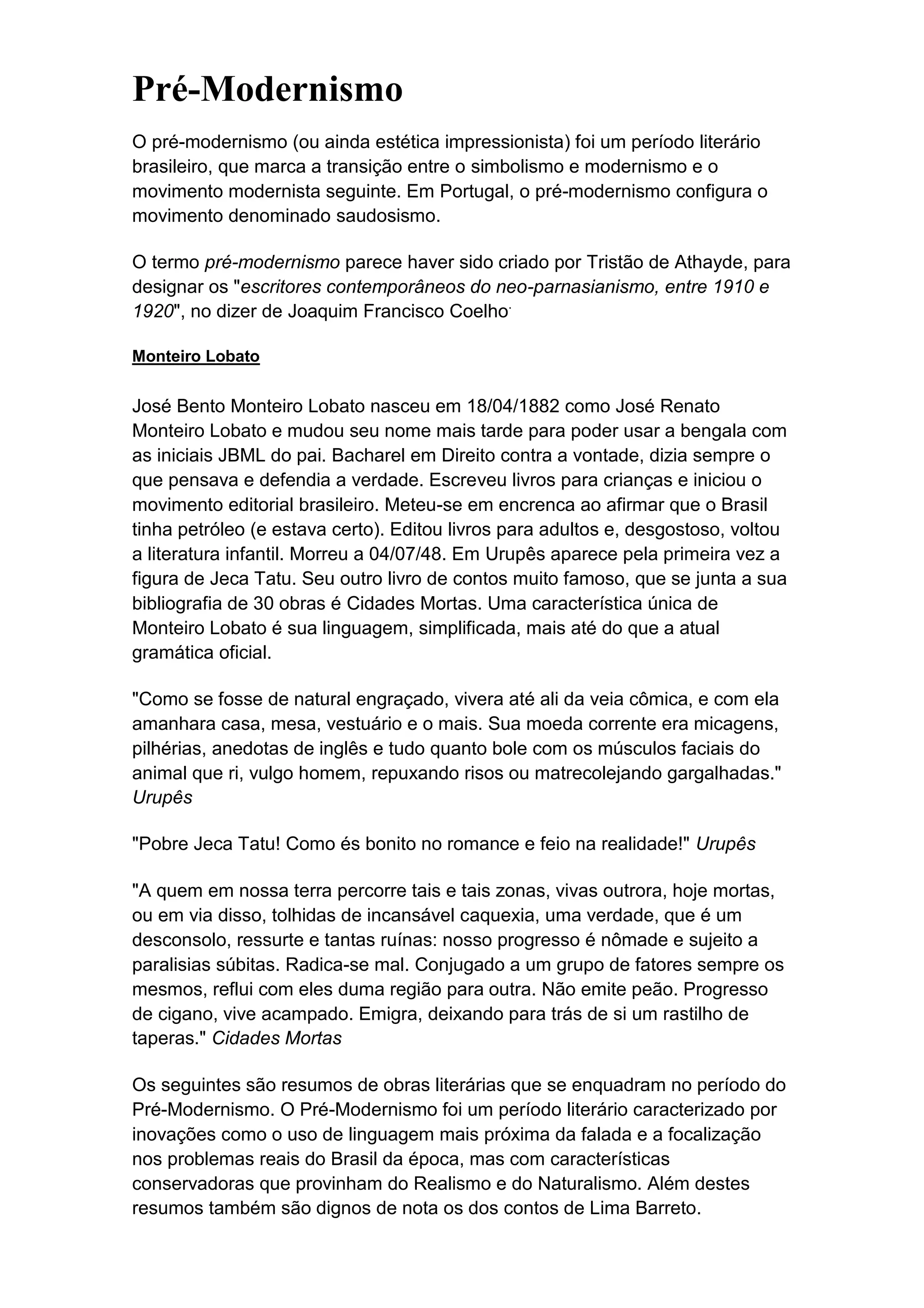 Este documento descreve o período literário Pré-Modernismo no Brasil, caracterizado por uma transição entre o Simbolismo e o Modernismo. Apresenta os principais autores desta fase como Monteiro Lobato, Lima Barreto e Euclides da Cunha, resumindo brevemente suas obras mais importantes, como Urupês, Cidades Mortas e Os Sertões. Também destaca traços comuns entre estas obras pré-modernistas, como a linguagem inovadora e a denúncia da realidade brasileira da época.