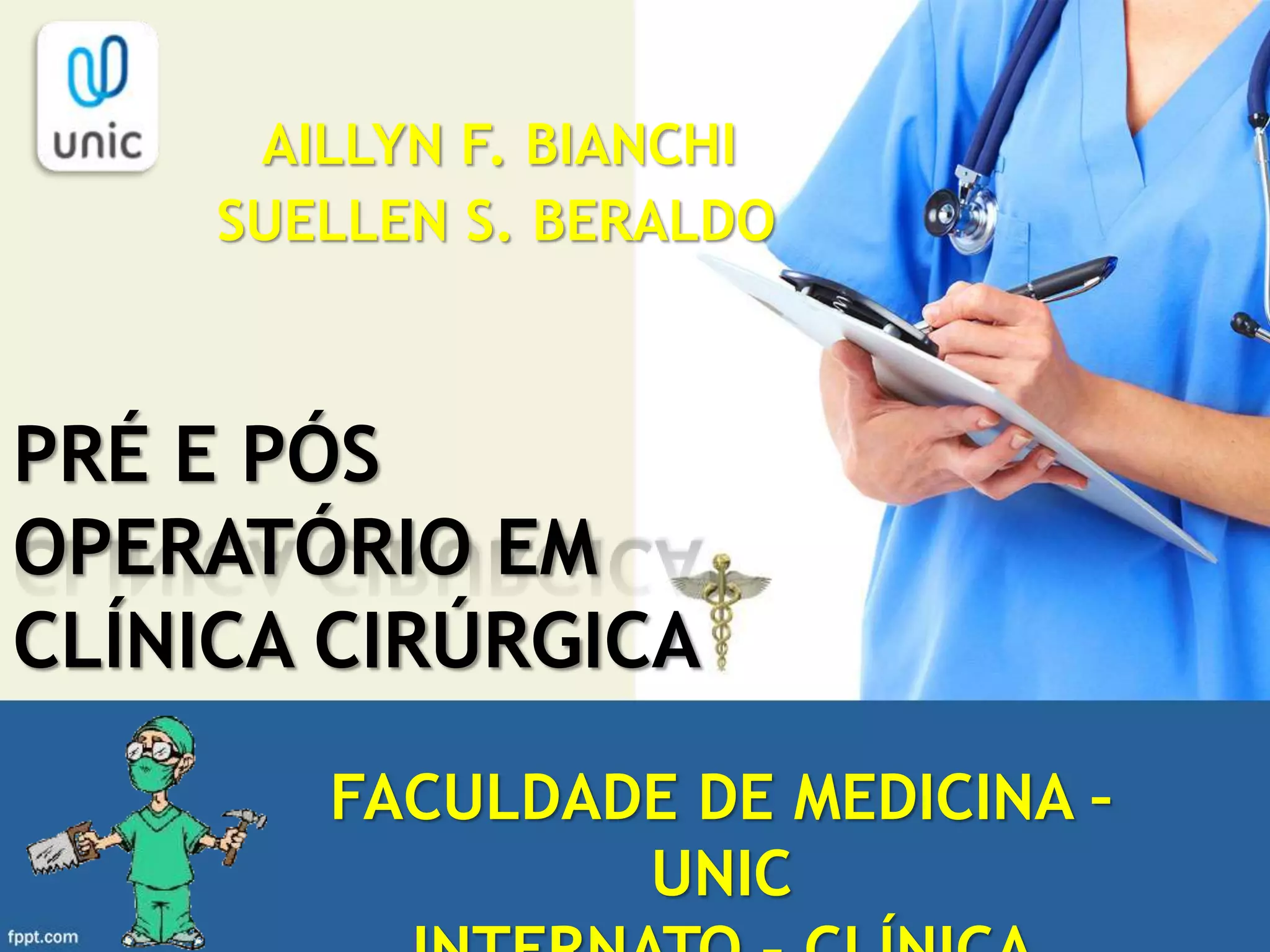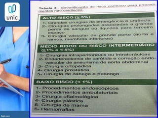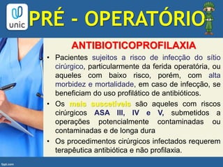 O documento aborda os cuidados pré e pós-operatórios em cirurgia, enfatizando a importância da antibioticoprofilaxia e da avaliação de riscos cirúrgicos. O pré-operatório é dividido em diversas etapas, incluindo anamnese, exames, preparo psicológico e suspensão de medicações, enquanto o pós-operatório se concentra na monitorização do estado do paciente e na reposição hidroeletrolítica. A boa técnica operatória e o manejo adequado são fundamentais para prevenir complicações e promover a recuperação do paciente.